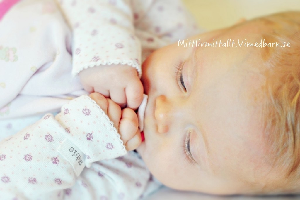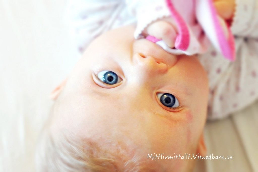 Oj oj oj vad tiden springer iväg. Det känns som att det var igår hon kom till oss samtidigt som det känns som om att hon alltid har varit med oss. Tänk att det var just den här skönheten som låg i min mage och att hon har legat i min mage, det är galet. M blir stadigare och stadigare för var dag som går, nu kan hon sitta med hjälp av lite kuddar runt sig. När hon ligger på mage så drar hon knäna mot magen och lyfter rygg och mage. Det ska bli kul och se när hon börjar att krypa om hon börjar vill säga. Ammar gör vi på kvällen och natten, annars är det vanlig mat som gäller under dagarna och M älskar all mat. Gapar och tuggar på 🙂 Att Ta nappflaska däremot det ratar hon, försökte nu vid läggning med lite välling men NEJ. Förstår inte varför hon inte vill ta flaska, jag blir så in i bomben låst. Håller tummarna att det släpper snart. Hmm annars så var vi förbi mamma idag och åt lunch det var trevligt som vanligt. Nu ska jag natta J, hoppas att ni har haft en bra dag.
