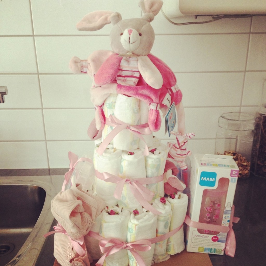 Gjorde en blöjtårta och firade att Mina skulle få en flicka.