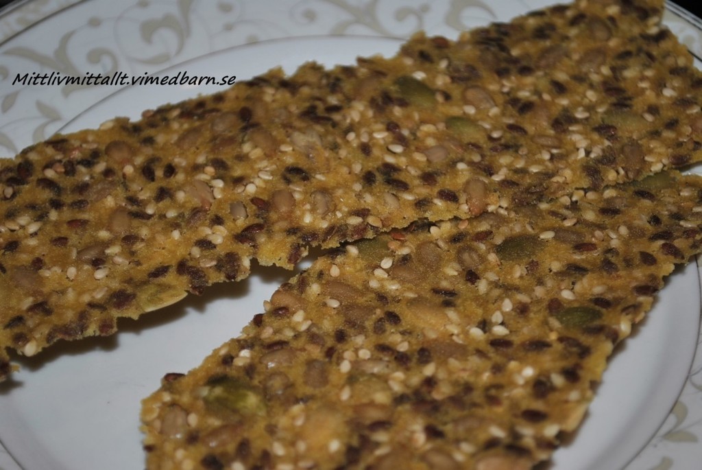 Ta ett bakplåtspapper och häll degen på sedan ett bakplåtspapper på. Kavla sedan ut degen, men inte för tunn det är lätt att den går sönder. Ca 3-5 mm. Strö över lite flingsalt och sist dela den i lagom bitar. In i ugnen i ca 45 minuter, klart!