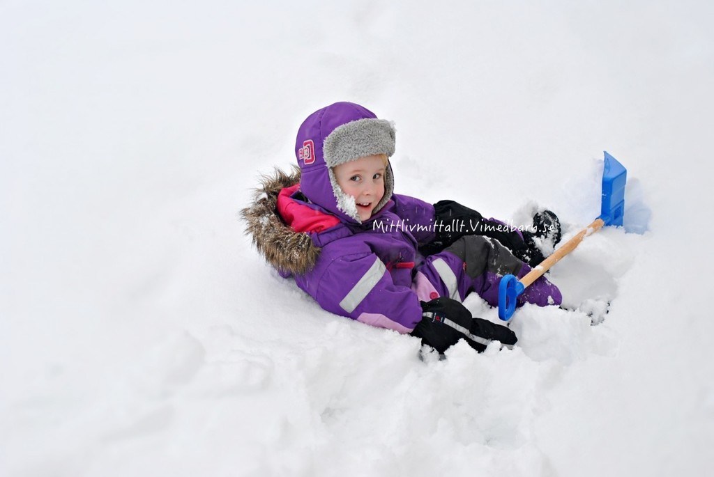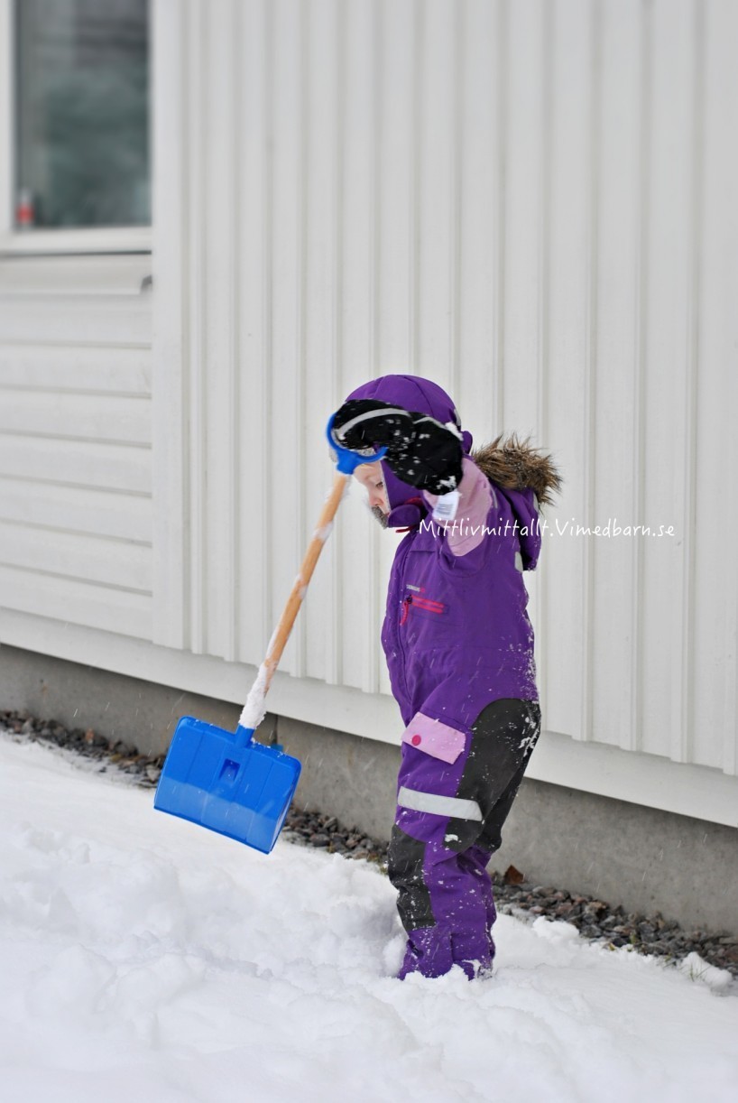 Vilket väder vi har, det har snöat nästan konstant i två dygn nu. T åkte i morse så det har bara varit vi tjejer idag 🙂 Vi började dagen med att gå ut och skotta snö och ta bort all snö på buskarna runt huset, dom går väl av annars så blöt och tung snö som har kommit. Men fy satan vad jobbigt det var. Helt slut haha tur att J hjälpte mig. Men eftersom att det har snöat underdagen så är det lika mycket snö nu, gahh! Så det är bara att börja om imorgon. Men men lite kul hade vi oxå, det är jobbigt med snö men vad gör det när barnen tycker det är så kul.