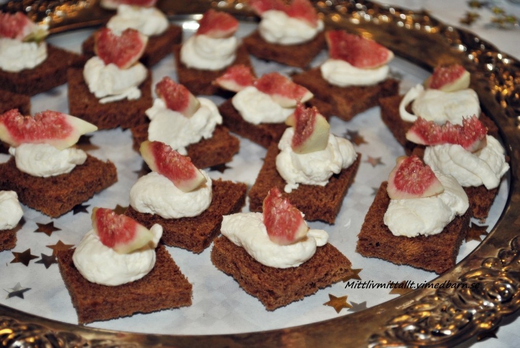 Blanda parmesanost och Philadelphia osten, skär varje kavring skiva i fyra bitar och spritsa eller bred på parmesan crèmen. Skölj och skär fikonen i tunna klyftor och lägg på toppen, klart! Super enkelt och gott 🙂