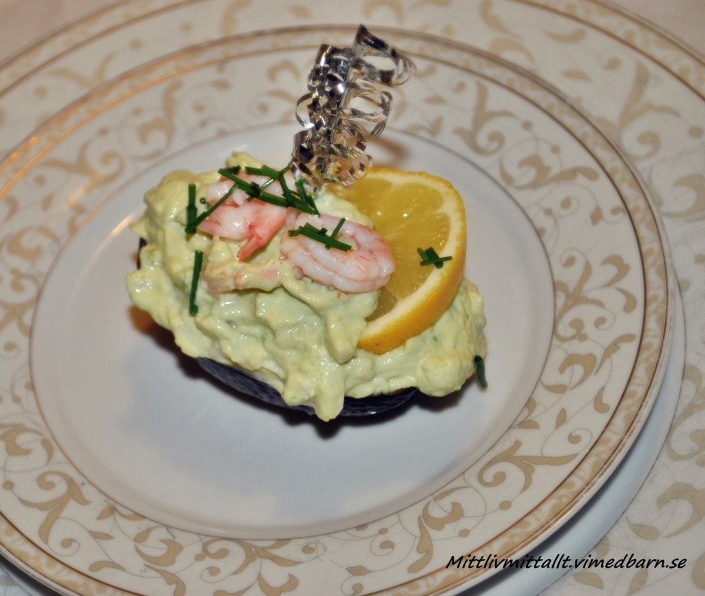 Dela avokadofrukterna, ta bort kärnorna och gröp ur köttet. Mosa avokadon och hacka äggen. Blanda räkor ( spara några till dekoration) avokado, ägg, majonnäs och créme fraiche och smaka av med citrinsaft och kryddor. Fyll de tomma skalen med röran och garnera med räkor och gräslök.