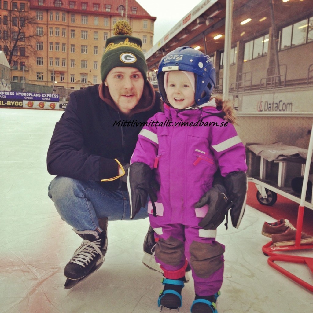 En lycklig tjej med sin pappa, skridskoåkningen var kul i en liten stund sedan ville J hem och läsa bok haha 🙂